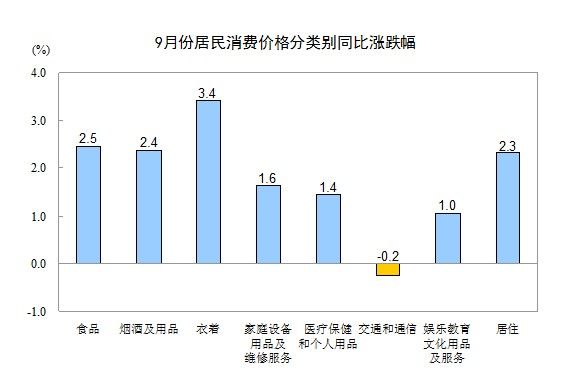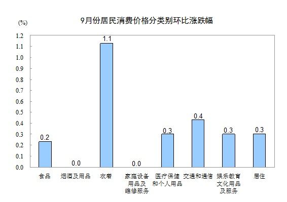 9月份,全國居民消費價格總水平環比上漲0.3%。其中,城市上漲0.3%,農村上漲0.4%;食品價格上漲0.2%,非食品價格上漲0.4%;消費品價格上漲0.4%,服務項目價格上漲0.3%。