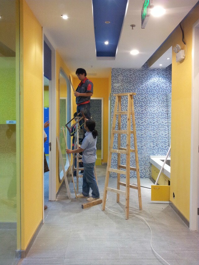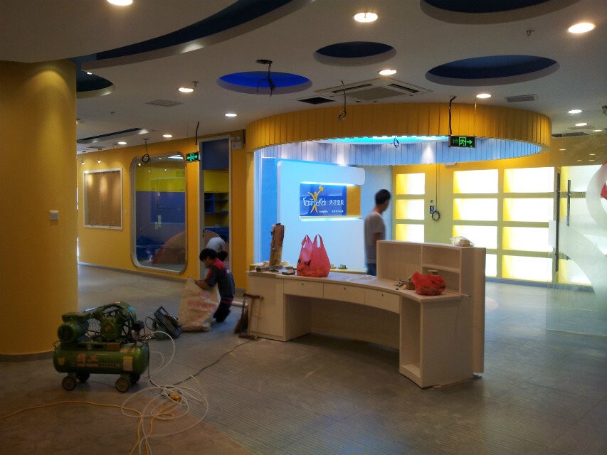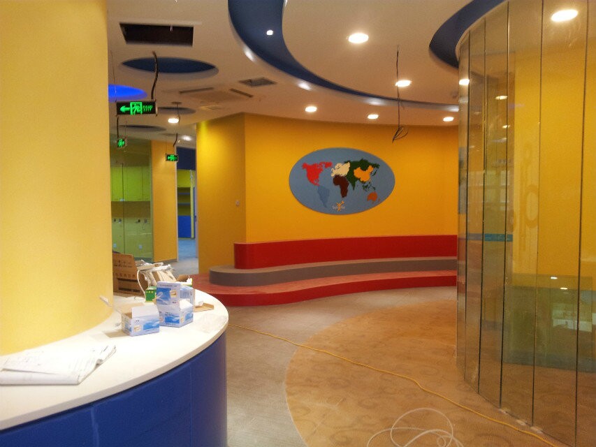施工還在進行,但是歡樂頌兒童樂園已初見規模,淺淺的柔和的黃色,淡淡的明快的藍色,沖撞色的巧妙搭配給讓耳目一新的感覺,而在這其中的精巧顏色對比,色塊的比例構成都極為和諧雅觀,自然的將藍的明快靚麗,黃色的熱烈輕盈襯托而出,迎面而來的弧度前臺,舒展著流暢的線條,自然的原木色澤在中央悄然佇立,它還在等待著全身涂滿晶亮的清漆,來遮蓋它原有的紋理和色澤,好像是小朋友穿上漂亮的衣服一般。走廊頂部采用的造型天花,圓圓的仿佛是天上的月亮,又像長在地上的蘑菇,分外親切可愛,而鑲嵌在造型圓之間的頂燈,灑下自然的白熾燈光,帶給內室一片光明。