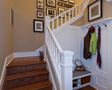 家中空間太小沒(méi)有衣帽間怎么辦,上面的這種拐角衣帽間設(shè)計(jì)則為你提供大大的便利,窄小的拐角可以放置下鞋柜和衣帽架等設(shè)施,而簡(jiǎn)約的白色不僅延續(xù)了整個(gè)樓梯的配色,而且也將衣帽間巧妙的隱藏了起來(lái),如此精巧設(shè)計(jì),簡(jiǎn)約大方,讓人喜愛(ài)不已。