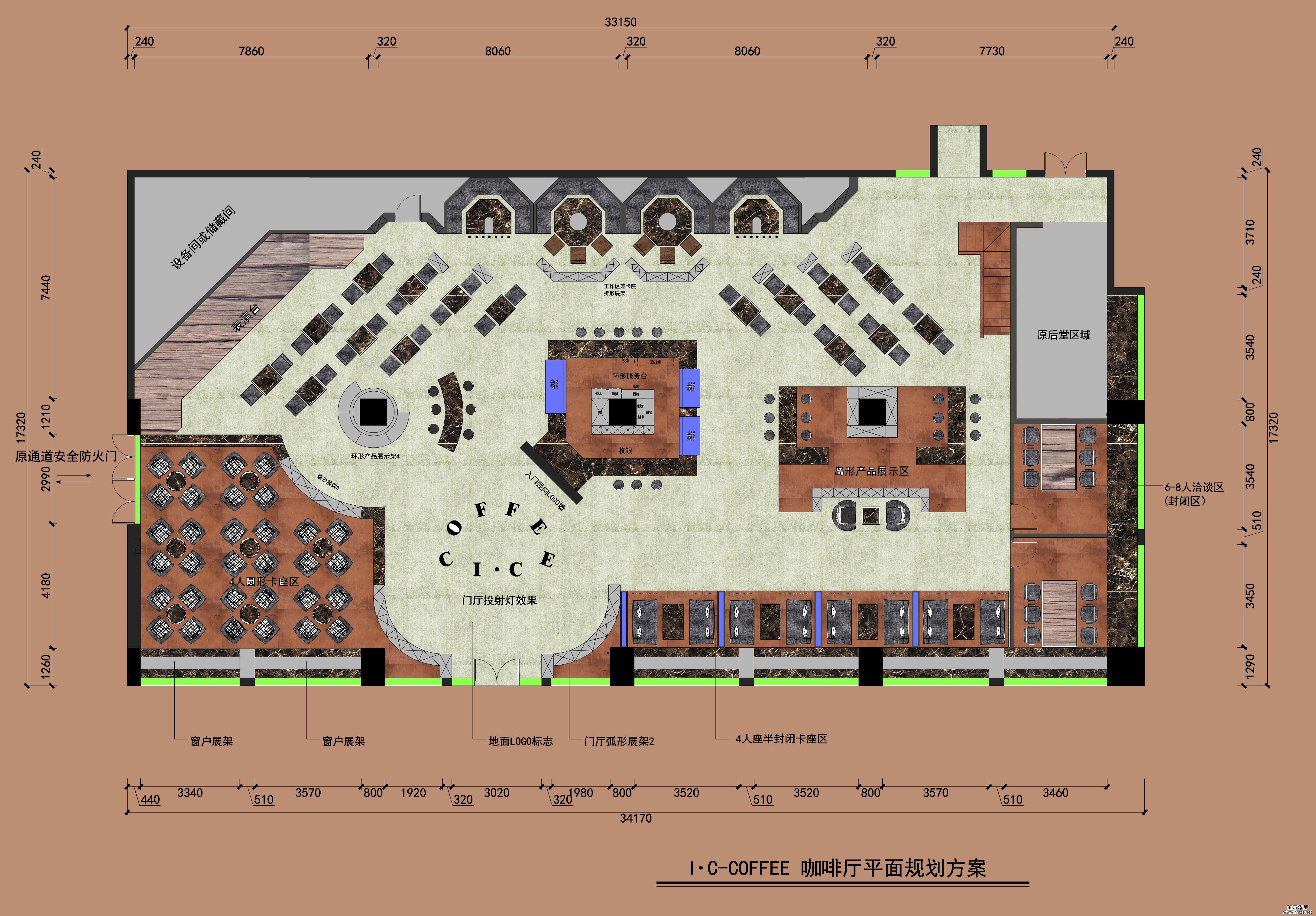 ▄設計風格定位: 針對當下咖啡廳特色、特點、結合IC咖啡的品牌、形象、服務、理念,由此裝飾設計的訴求點在未來5-15年的經營過程中完勝于周圍已存在的類似性經營場所。因項目處于建筑物一層,市政綠化帶以內無視線阻擋,視線開闊,門頭設計可反向于原建筑幕墻體增加咖啡廳的特點,又不失檔次,夜幕下利用櫥窗展示體現出亮化效果。 此案例的主要風格是復古工業風,空間布局上以環形動線為主,分為入場主動線、入各功能區輔助線、展示區觀賞停頓動線,環型服務臺可服務四周。以經營者的思路易進不易出的動線設計,橫向流動,豎向45度向內引導“八”字形設計,聚焦于前位島式展臺、中位環形服務臺、內位表演區及藝術長廊式展架,第一個點都留有讓消費者駐足的理由。 在空間構成上,呈現出最佳設計效果,材料的合理運用體現了裝飾的最佳立體質感,局部采用金屬色、銹紅色以及深色,為了更好的體現整個咖啡廳的氛圍,立面材料運用多元而不繁雜,燈光和家具的選用也是重中之重。