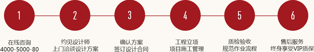 經過年的沉淀,我們將繁雜的裝修流程系統優(yōu)化精簡至6大步驟,緊密貼合您的需求,為您提供舒適的裝修體驗